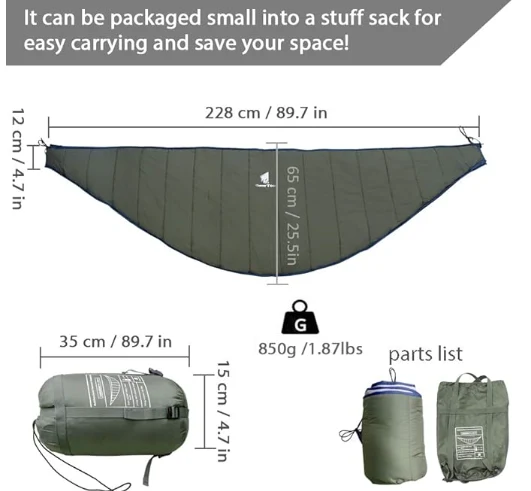 Kampa Rêwîtiyê Hammock, rehetiya bagê ya razanê û bi hêsanî li ser hammockek standard a hişk bicîh bikin, hûn di hewaya sar de germ bikin., Ltd. Ew ji bo kampan, paşpirtik, nêçîrvan, çalakiyên derveyî, çiyayî bêkêmasî ye